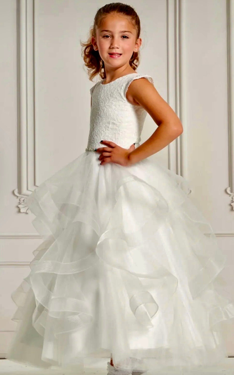 Beautiful Communion Dress with elegant lace bodice and flutter cap lace sleeve, beaded waistline and tulle tierred skirt with horsehair trim Tea-Length