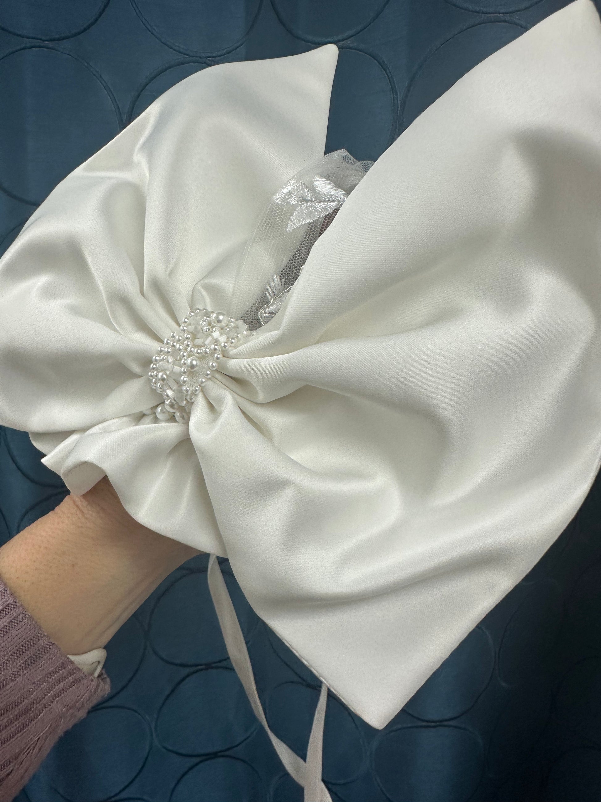 Beautiful heirloom gown is both traditional and elegant. Paula gown features floral lace bodice with exquisite pearl trim along neckline, beautiful bow with pearl detail at waist, puffed lace sleeves and luxurious floral lace overlay with scalloped hem. Gorgeous matching bonnet to complete the look.