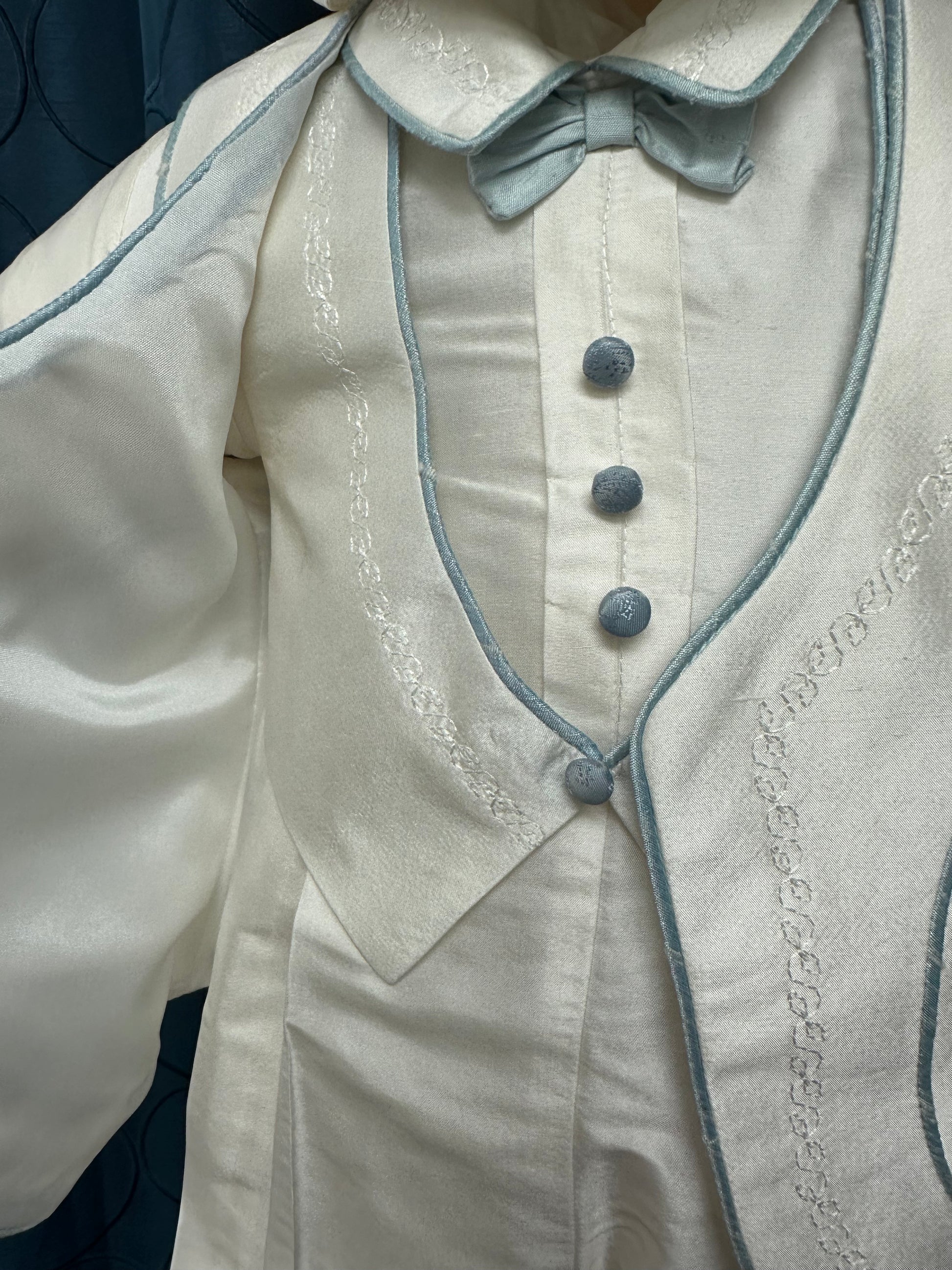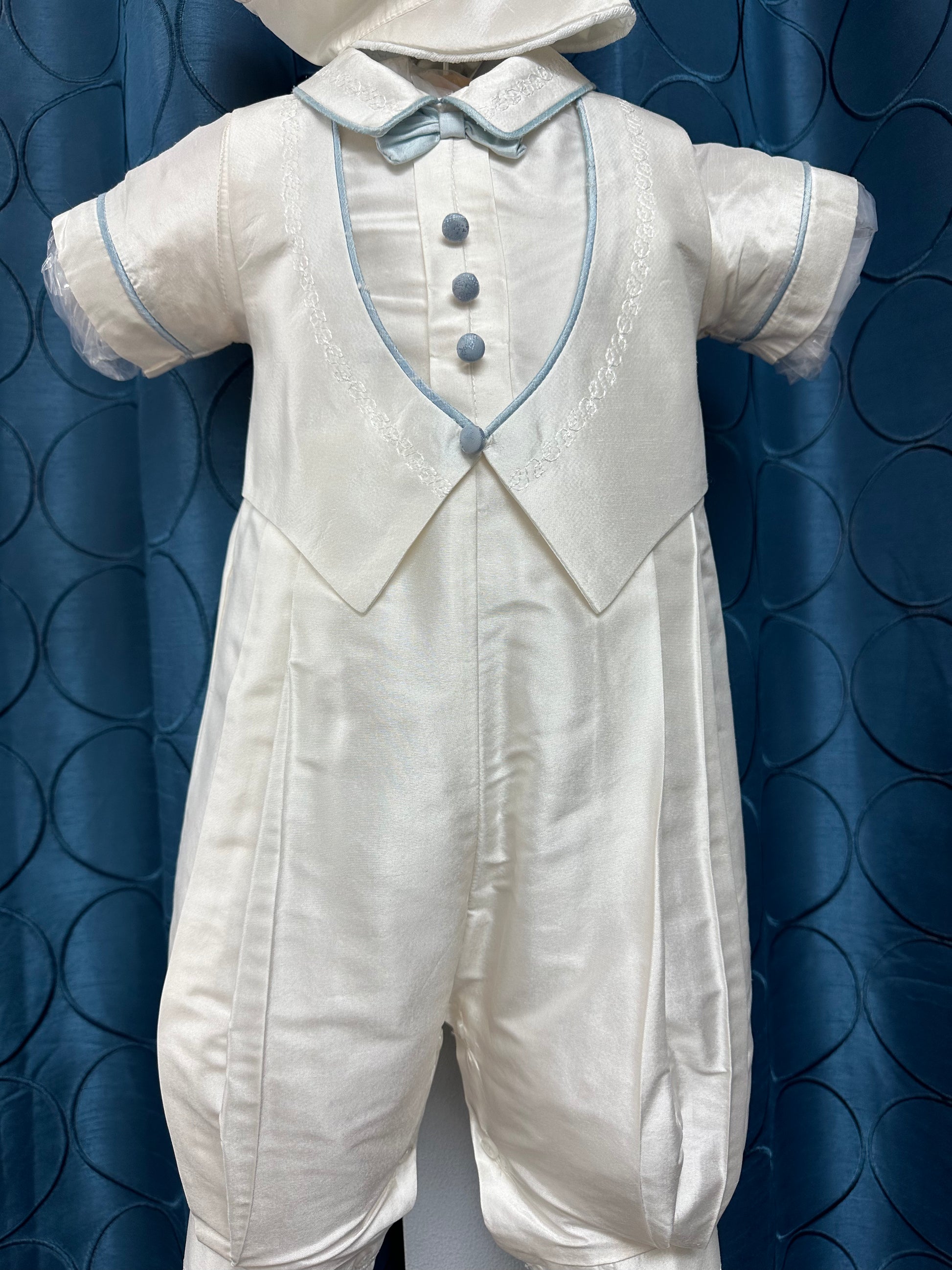 Silk boys outfit with blue trim detail features one-piece suit with vest, bow tie and jacket. Jacket has embroidered detail and piping trim. Button back and inseam closure for easy fitting. Matching cap to complete the look.